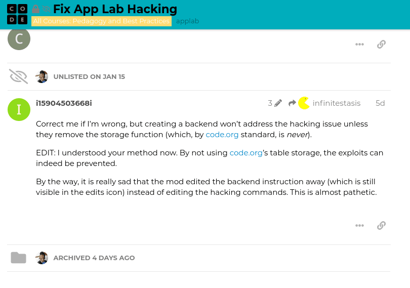 Multiple people including myself have had countless problems with people changing and deleting data tables. People have mentioned this multiple times yet code .org wont do anything about it and instead hide their mistakes.