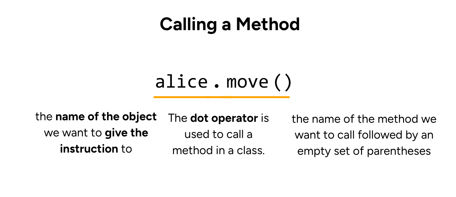 is not the name of the object. It is the variable that holds an object. Invoking the name of a variable references the contents.- The dot operator is used to reference not to call.